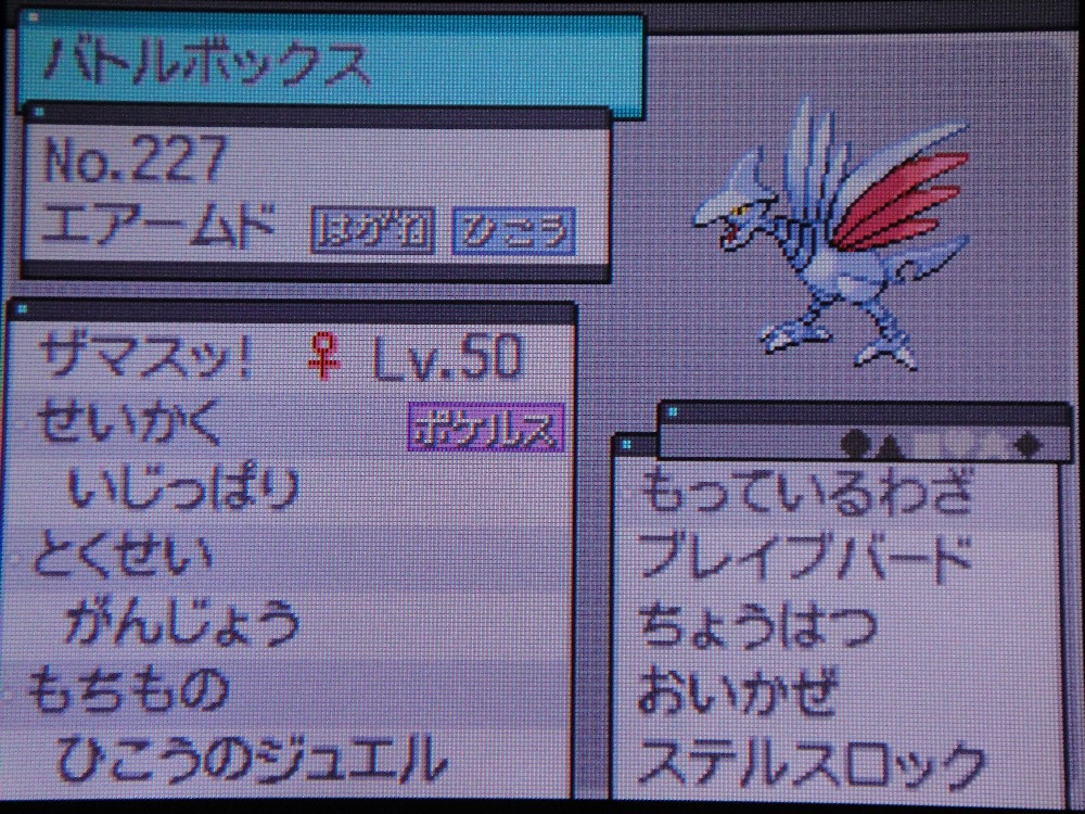 エアームドを見るといつもラルクの『Driver's High』の歌の「鋼のつば~さで~♪」って歌詞を思い出すうぉーりーですw (因みに別にファンではありません